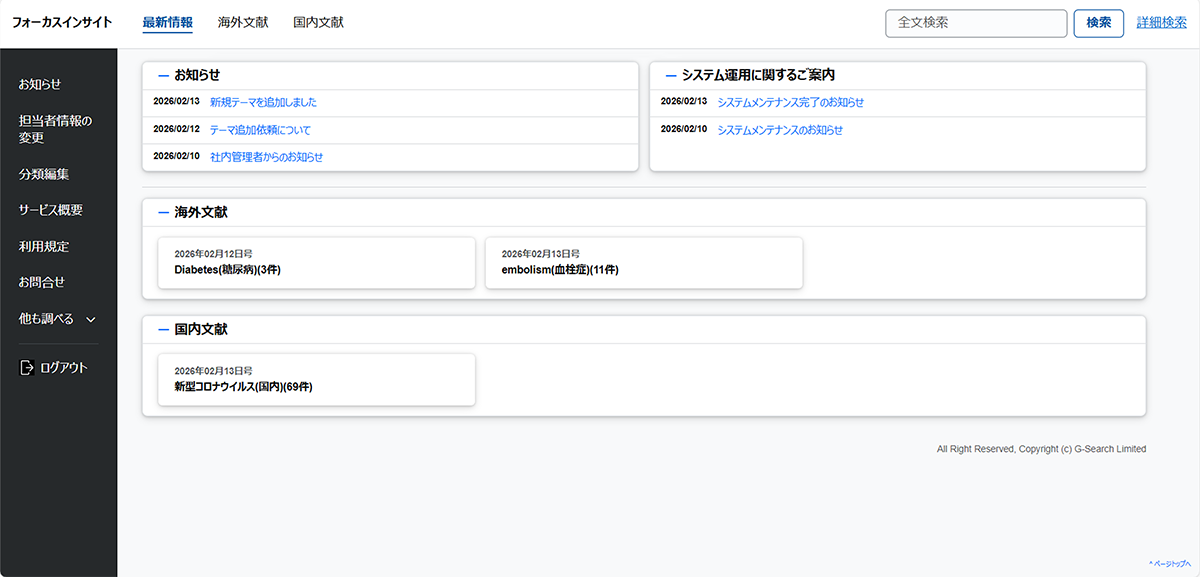 フォーカスインサイトは、国内外の文献情報や、各国官公庁・業界HP/メルマガ等を通じて公開される外部環境情報を効率的に監視し、組織内で評価・管理できる専用ポータルサイトです。